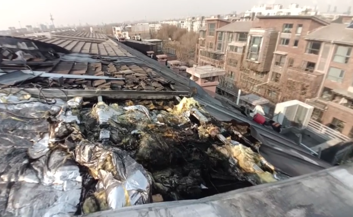 据了解,12月10日上午8时许,施工队在该户楼顶进行保暖和防水施工作业,施工负责人张某某指派施工人员宋某某、荣某某,在该户楼顶使用喷灯进行明火作业,施工过程中,喷灯持续烘烤防水卷材表层油毡,因操作距离过近、火源温度过高,致使油毡迅速熔化并起火燃烧,火势随即沿防水层蔓延,引发火灾,业主发现楼顶冒烟后,立即拨打119电话报警,附近消防救援站接警后迅速到场及时处置,才避免了火灾进一步扩大蔓延。